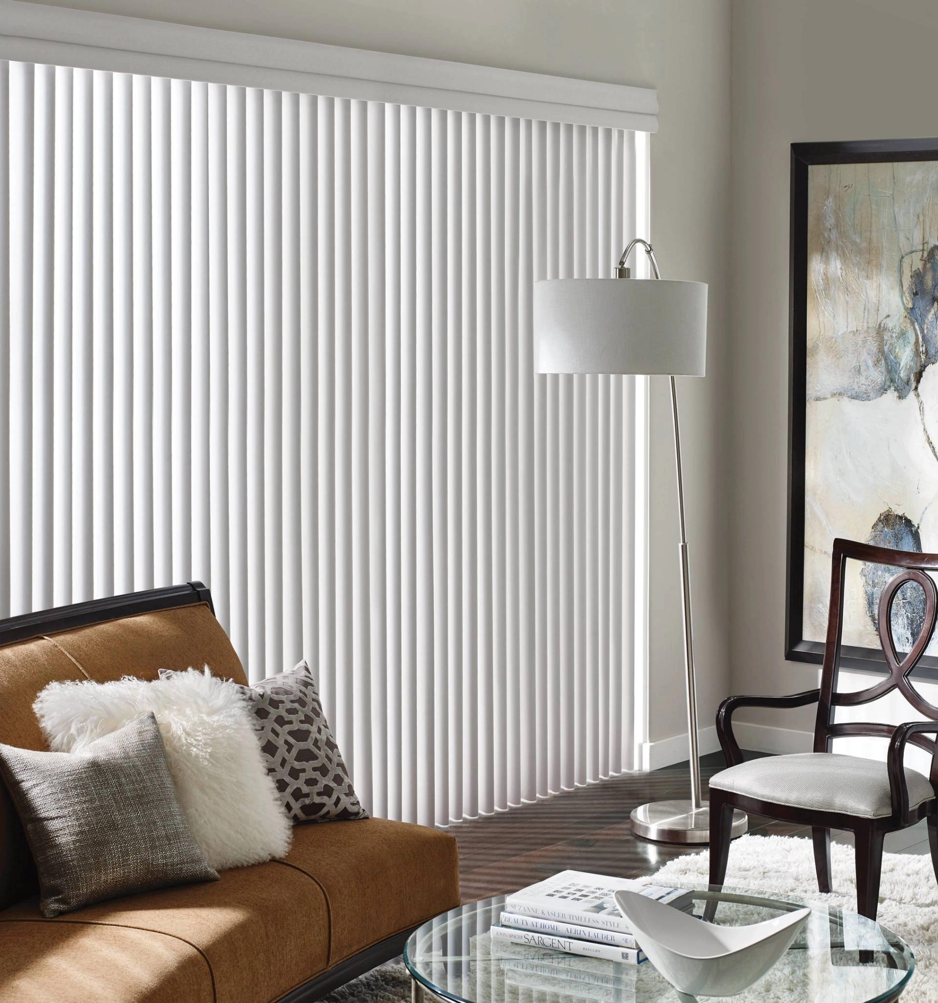 Cadence® Vertical Blinds are elegantly styled vertical blinds with plush drapery-like folds, perfect for sliding glass doors and wide windows. Control your light and privacy by adjusting the 3.65” louvers. You can also select from a variety of stacking options: left, right, split, or center. They move smoothly and silently and come in over 40 beautifully textured fabrics and colors. Here are our favorite white hues.