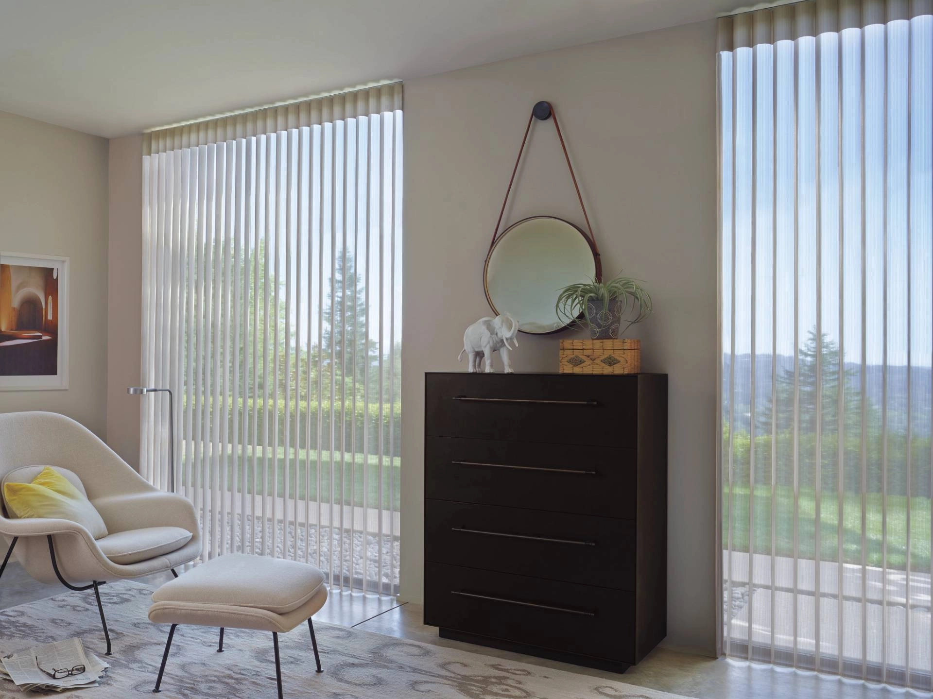 Vertical blinds are always one of the best fits for sliding glass doors. Their vertical dimension adds height to a door, making your room appear larger. We are incredibly pleased to offer four styles of Hunter Douglas vertical blinds, each with unique features and attributes that make them the ideal modern window treatments for sliding glass doors.